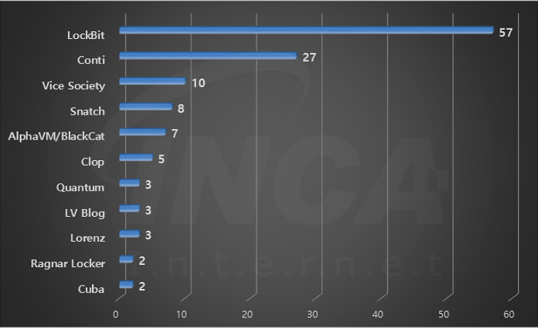 2022년 5월(5월 1일 ~ 5월 31일)에 발생한 데이터 유출 현황을 랜섬웨어 진단명 별로 비교하였을 때 “LockBit” 랜섬웨어가 57건으로 가장 많은 데이터 유출이 있었고, “Conti” 랜섬웨어가 27건으로 두번째로 많이 발생했다.