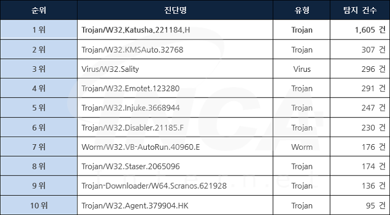 2022년 5월(5월 1일 ~ 5월 31일) 한 달간 잉카인터넷 대응팀은 사용자에게 가장 많이 피해를 준 악성코드 현황을 조사하였으며, [표 1]은 가장 많이 탐지된 악성코드를 탐지 건수 기준으로 정리한 악성코드 Top10이다. 가장 많이 탐지된 악성코드는 Trojan 유형이며 총 1,605건이 탐지되었다.