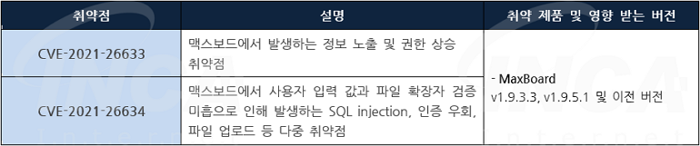 맥스보드 사는 제품에서 발생하는 취약점에 대한 보안 업데이트를 발표하고, 관련 취약점을 해결하기 위해 최신 버전으로 업데이트할 것을 권고하였다.