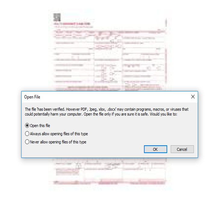 이 PDF 파일을 Adobe Reader로 실행할 경우 내부에 포함된 악성 docx 파일 실행을 요청하는 메시지 박스를 띄우는데, 해당 악성 파일의 이름에 "has been verified"라는 문장이 포함되어 있어 사용자들로 하여금 의심을 피하고 실행을 유도한다.