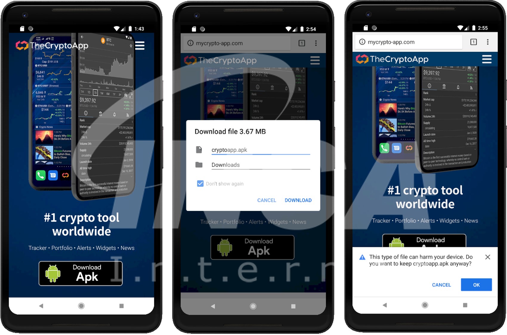 암호화폐에 대한 관심이 높아지는 만큼 암호화폐 관련 앱을 위장한 악성 앱이 다양한 방식으로 유포된다. 최근에 암호화폐의 가격 및 뉴스 등을 알려주는 암호화폐 포트폴리오 트래커(Crypto Portfolio Tracker) 앱을 위장한 악성 코드 MaliBot이 등장하였다. 해당 악성코드는 안드로이드 단말기를 대상으로 하여, 웹사이트 및 SMS 등으로 유포되었다. 해당 앱을 실행하면, 단말기에 저장된 각종 정보를 탈취하고 원격제어 등의 악성 동작을 수행한다.