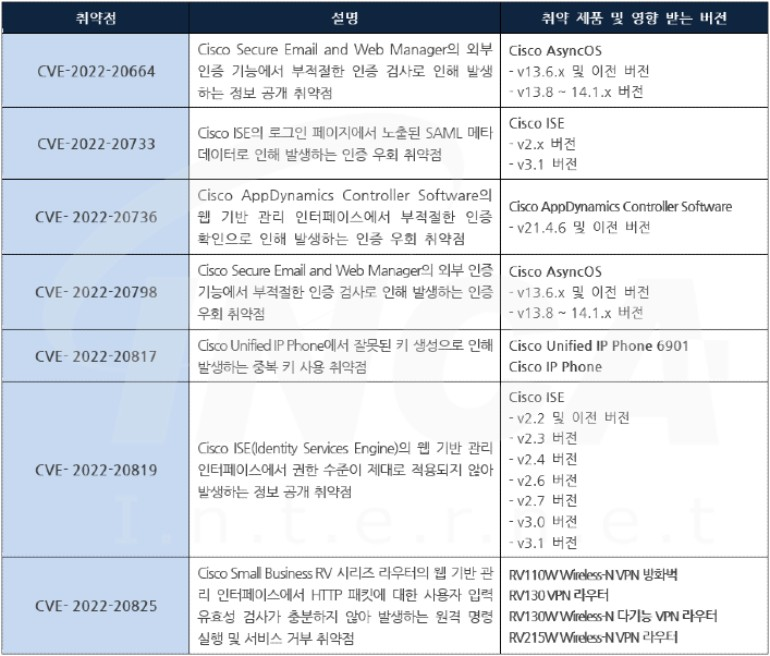 Cisco 사는 제품에서 발생하는 취약점에 대한 보안 업데이트를 발표하고, 관련 취약점을 해결하기 위해 최신 버전으로 업데이트할 것을 권고하였다.