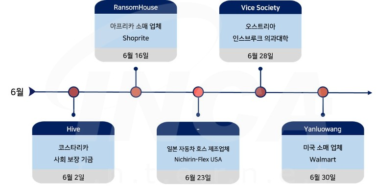 2022년 6월(6월 1일 ~ 6월 30일) 한 달간 랜섬웨어 동향을 조사한 결과, 코스타리카의 사회 보장 기금이 "Hive" 랜섬웨어 공격을 받은 정황이 발견됐으며, 아프리카 소매 업체 Shoprite와 오스트리아 인스브루크 의과대학이 각각 "RansomHouse" 랜섬웨어와 “Vice Society” 랜섬웨어 공격을 받았다. 또한, 미국 소매 업체 Walmart가 “Yanluowang” 랜섬웨어 공격을 받았으며, 일본 자동차 호스 제조업체 Nichirin의 자회사 Nichirin-Flex USA가 랜섬웨어 공격을 받아 운영에 영향을 미친 사건이 있었다.