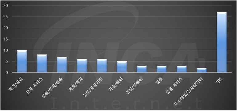 2022년 6월(6월 1일 ~ 6월 30일)에 발생한 데이터 유출 건을 산업별로 비교하였을 때 제조/공급 분야가 가장 많은 공격을 받았고, 교육 서비스 분야가 그 뒤를 따랐다.
