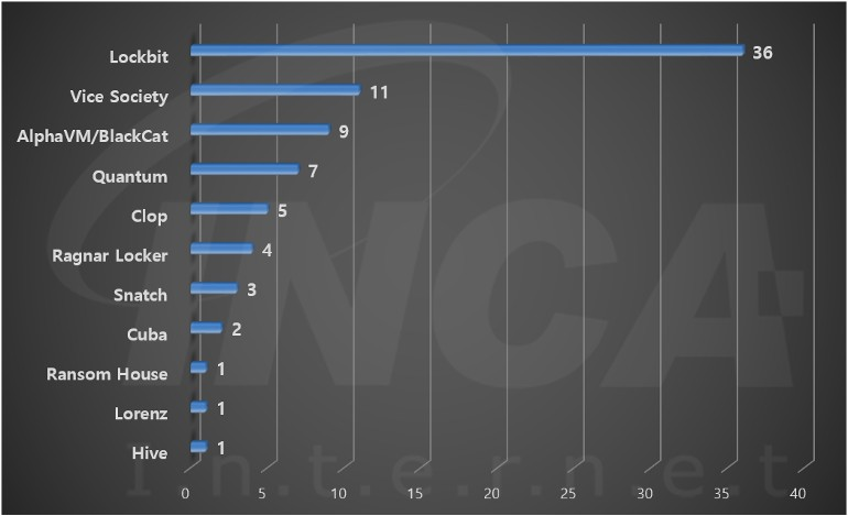 2022년 6월(6월 1일 ~ 6월 30일)에 발생한 데이터 유출 현황을 랜섬웨어 진단명 별로 비교하였을 때 “LockBit” 랜섬웨어가 36건으로 가장 많은 데이터 유출이 있었고, “Vice Society” 랜섬웨어가 11건으로 두번째로 많이 발생했다.
