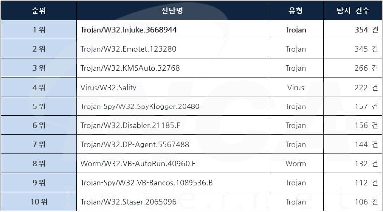 2022년 6월(6월 1일 ~ 6월 30일) 한 달간 잉카인터넷 대응팀은 사용자에게 가장 많이 피해를 준 악성코드 현황을 조사하였으며, [표 1]은 가장 많이 탐지된 악성코드를 탐지 건수 기준으로 정리한 악성코드 Top10이다. 가장 많이 탐지된 악성코드는 Trojan 유형이며 총 354건이 탐지되었다.