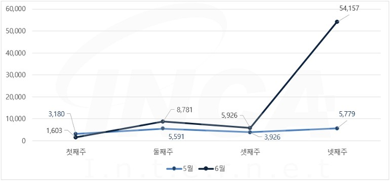 6월 한달 동안 악성코드 진단 현황을 주 단위로 살펴보았을 때 5월에 비해 증가한 추이를 보이고 있다.