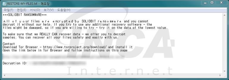 파일명에 ".solidbit" 확장자를 추가하고 "RESTORE-MY-FILES.txt"라는 랜섬노트를 생성하는 "SolidBit" 랜섬웨어가 발견됐다.