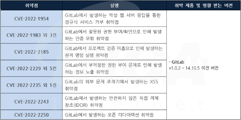 GitLab 사는 제품에서 발생하는 취약점에 대한 보안 업데이트를 발표하고, 관련 취약점을 해결하기 위해 최신 버전으로 업데이트할 것을 권고하였다.