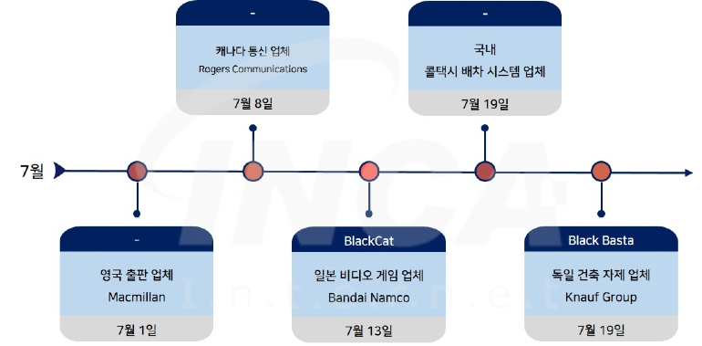 2022년 7월(7월 1일 ~ 7월 31일) 한 달간 랜섬웨어 동향을 조사한 결과, 영국의 출판 업체 Macmillan과 캐나다의 통신 업체 Rogers Communications가 랜섬웨어 공격을 받은 정황이 발견됐으며, 일본의 비디오 게임 업체 Bandai Namco가 "BlackCat" 랜섬웨어 공격을 받았다. 또한, 국내 콜택시 배차 시스템 업체가 랜섬웨어 공격을 받았으며, 독일 건축 자제 업체 Knauf Group이 “Black Basta” 랜섬웨어 공격을 받아 운영에 영향을 미친 사건이 있었다.