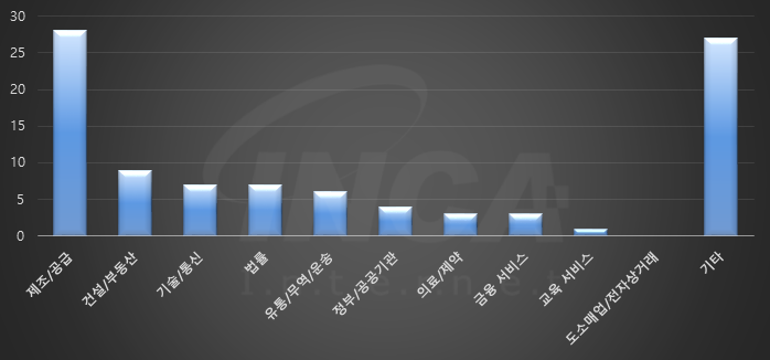 2022년 7월(7월 1일 ~ 7월 31일)에 발생한 데이터 유출 건을 산업별로 비교하였을 때 제조/공급 분야가 가장 많은 공격을 받았고, 건설/부동산 분야가 그 뒤를 따랐다.