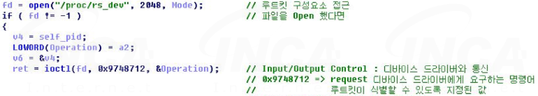 루트킷 악성코드를 실행한 뒤 프로세스와 포트를 숨김 처리한다. (분석 샘플의 경우 루트킷 실행 코드는 존재하지만, 루트킷 데이터가 존재하지 않는다)