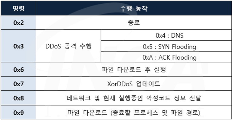 아키텍쳐, 커널버전, 메모리, CPU, IP 및 LAN 속도 정보를 수집한 뒤 인코딩하여 C&C 서버로 전달하고, 공격자의 명령을 전달받아 아래 [표 1] 과 같은 명령을 수행한다. 그러나 분석 시점에서는 연결되지 않는다.