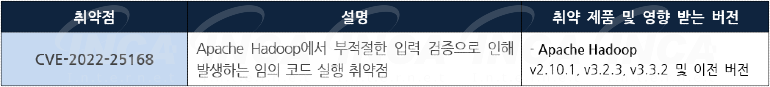 Apache 재단은 제품에서 발생하는 취약점에 대한 보안 업데이트를 발표하고, 관련 취약점을 해결하기 위해 최신 버전으로 업데이트할 것을 권고하였다.