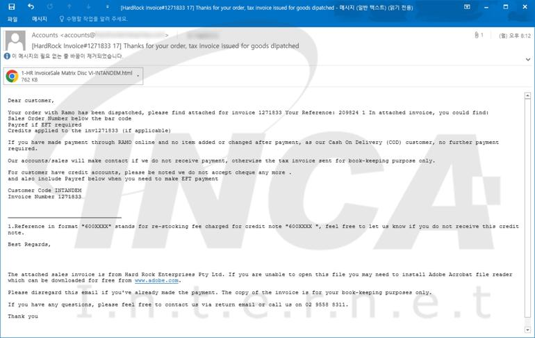 해당 피싱 메일은 "[HardRock Invoice#1271833 17] Thanks for your order, tax invoice issued for goods dipatched"라는 제목으로 유포되며, 호주의 온라인 패션 의류 업체 H사를 사칭해 첨부파일 실행을 유도한다.