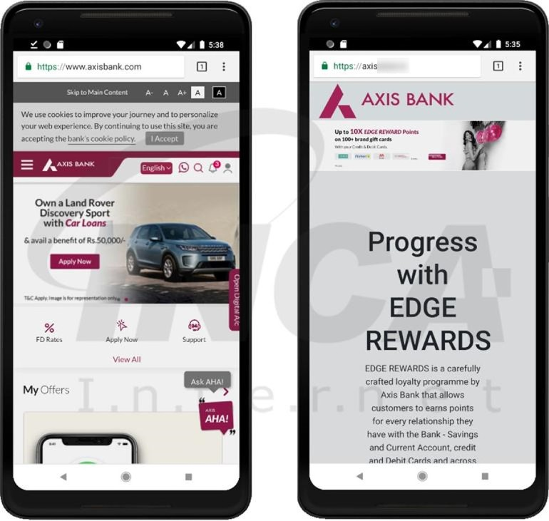 인도의 은행 및 금융 서비스 회사인 Axis Bank를 사칭한 악성 앱이 유포되었다. 해당 앱은 Axis Bank의 정상 웹사이트와 유사한 모습의 사이트에서 유포되었으며, 앱을 실행하면, 문자메시지 정보 및 사용자가 입력한 정보를 탈취한다.