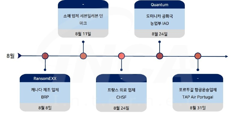2022년 8월(8월 1일 ~ 8월 31일) 한 달간 랜섬웨어 동향을 조사한 결과, 캐나다 제조 업체 Bombardier Recreational Products와 도미니카 공화국의 농업부가 각각 “RansomEXX”와 “Quantum” 랜섬웨어 공격을 받은 정황이 발견됐다. 또한, 덴마크에 위치한 세븐일레븐과 프랑스 의료 업체 Center Hospitalier Sud Francilien 및 포르투갈의 항공운송업체 TAP Air Portugal가 사이버 공격을 받아 운영에 영향을 미친 사건이 있었다.