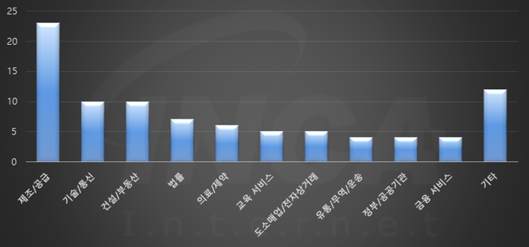 2022년 8월(8월 1일 ~ 8월 31일)에 발생한 데이터 유출 건을 산업별로 비교하였을 때 제조/공급 분야가 가장 많은 공격을 받았고, 기술/통신 및 건설/부동산 분야가 그 뒤를 따랐다.