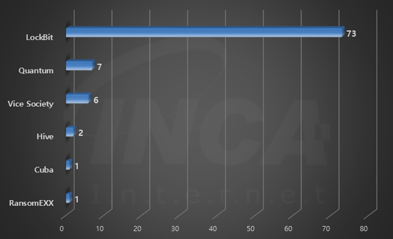 2022년 8월(8월 1일 ~ 8월 31일)에 발생한 데이터 유출 현황을 랜섬웨어 진단명 별로 비교하였을 때 “LockBit” 랜섬웨어가 73건으로 가장 많은 데이터 유출이 있었고, “Quantum” 랜섬웨어가 7건으로 두번째로 많이 발생했다.