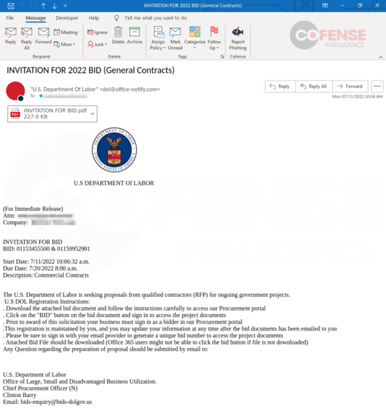 보안 업체 Confense에 따르면, 공격자가 미국 정부의 계약업체에게 프로젝트 입찰 내용으로 위장한 피싱 메일을 보내, Microsoft 계정 탈취를 유도하는 것으로 알려졌다.