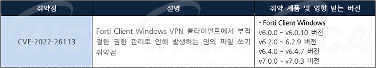 Fortinet 사는 제품에서 발생하는 취약점에 대한 보안 업데이트를 발표하고, 관련 취약점을 해결하기 위해 최신 버전으로 업데이트할 것을 권고하였다.