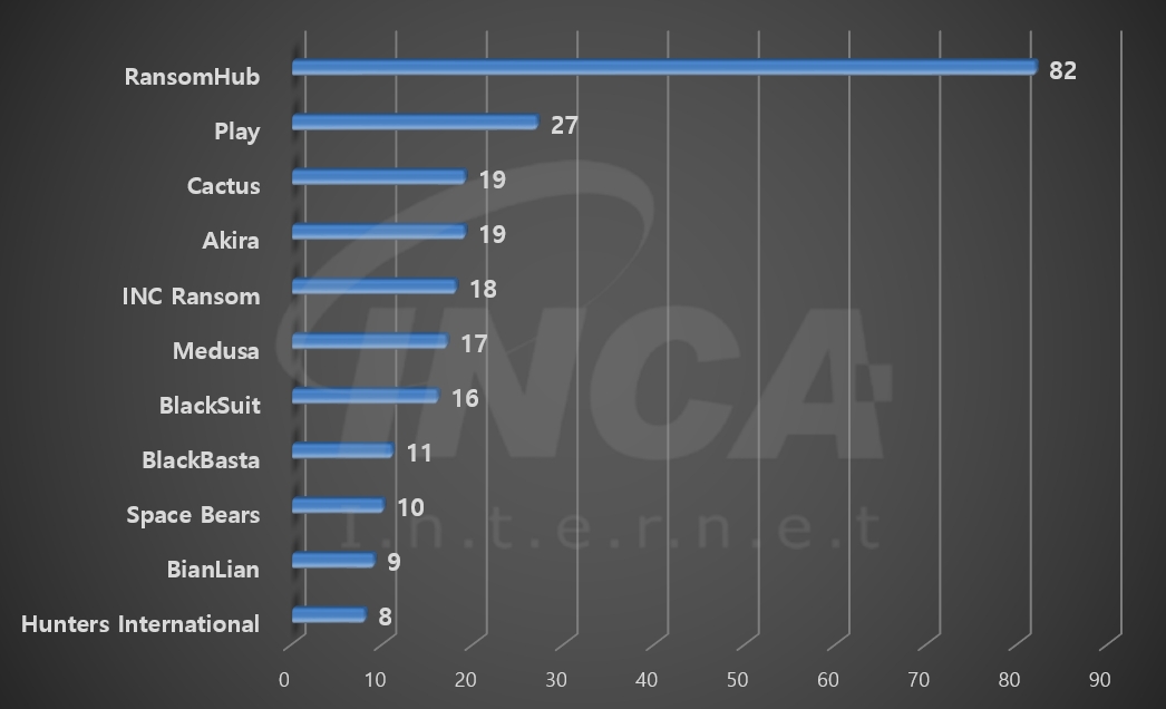 2024년 6월(6월 1일 ~ 6월 30일)에 발생한 데이터 유출 현황을 랜섬웨어 진단명 별로 비교하였을 때 “RansomHub” 랜섬웨어가 82건으로 가장 많은 데이터 유출이 있었고, “Play” 랜섬웨어가 27건의 유출 사례를 기록했다.