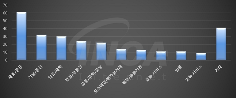 2024년 6월(6월 1일 ~ 6월 30일)에 발생한 데이터 유출 건을 산업별로 비교하였을 때 제조/공급 분야가 가장 많은 공격을 받았고, 기술/통신 분야와 의료/제약 분야가 그 뒤를 따랐다.