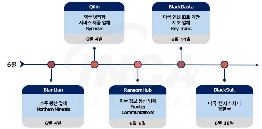 2024년 6월(6월 1일 ~ 6월 30일) 한 달간 랜섬웨어 동향을 조사한 결과, "Qilin" 랜섬웨어가 영국의 병리학 서비스 제공 업체 Synnovis를 공격한 정황이 발견됐다. 또한, 미국의 정보 통신 업체 Frontier Communications와 미국의 인쇄 회로 기판 제조 업체 Key Tronic에서 각각 "RansomHub"와 "BlackBasta" 랜섬웨어의 공격을 받았던 정황이 알려졌다. 한편, 호주 광산 업체 Northern Minerals와 미국 캔자스시티의 경찰국은 각각 "BianLian"과 "BlackSuit"의 공격으로 데이터가 유출된 정황이 전해졌다.