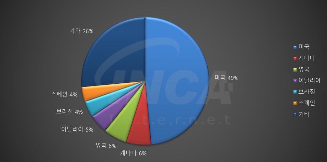 2024년 6월(6월 1일 ~ 6월 30일)에 발생한 데이터 유출 건을 국가별로 비교하였을 때 미국이 49%로 가장 높은 비중을 차지했고, 캐나다와 영국이 6%로 그 뒤를 따랐다.