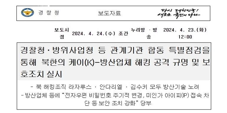 이에 대해 경찰청은 방산 기술을 탈취하는 목적을 가진 북한의 공격 시도가 지속해서 있을 전망이라고 전했다. 또한, 방산 업체뿐만 아니라 협력 업체도 보안 조치를 강화해야 한다고 당부했다.