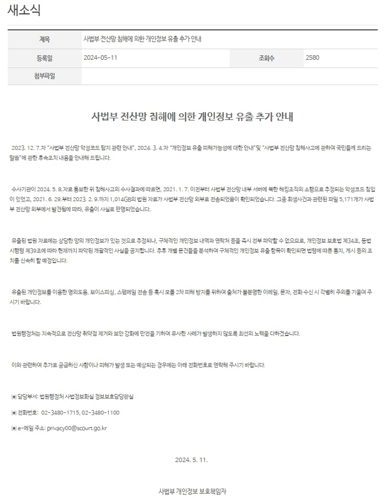 이 외에도 국내 사법부 전산망에서 북한 해커 조직의 소행으로 발생한 침해사고의 수사결과에 대해 발표했다. 법원행정처는 2021년 1월 이전부터 악성코드의 침입이 있었으며 이후 6월부터 2023년 2월까지 총 1,014GB의 자료가 외부로 전송된 사실을 확인했다고 전했다. 그 중 4.7GB에 해당하는 것으로 알려진 5,171개의 회생 사건 관련 파일이 외부에서 발견됐다.