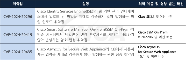 Cisco 사는 제품에서 발생하는 취약점에 대한 보안 업데이트를 발표하고, 관련 취약점을 해결하기 위해 최신 버전으로 업데이트할 것을 권고하였다.