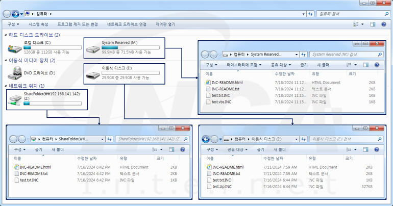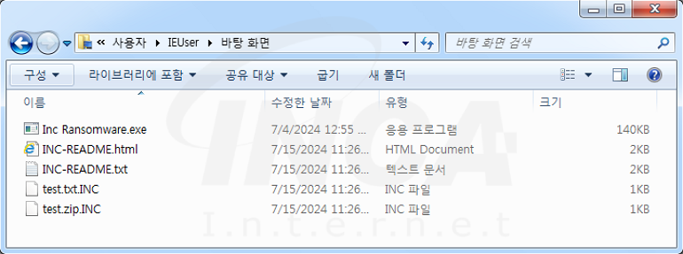“Inc” 랜섬웨어는 감염 대상을 지정하는 등의 옵션을 제공하며, 암호화를 완료한 파일에 “.INC” 확장자를 추가한다. 옵션을 사용하지 않으면 활성화된 드라이브를 대상으로 감염하고, 옵션에 따라 파일과 디렉터리를 별도로 지정하거나 마운트 되지 않은 드라이브를 직접 마운트해 추가 감염을 진행한다. 이 외에도 윈도우 리스타트 매니저(Windows Restart Manager)로 암호화할 파일을 사용하는 프로세스를 종료하거나, 볼륨 섀도우 복사본의 저장 공간 크기를 변경해 시스템 복구를 불가능하게 한다. 암호화 이후에는 랜섬노트가 생성되며, 이 랜섬노트의 내용이 동일하게 추가된 이미지로 바탕화면을 변경해 감염 사실을 알린다.