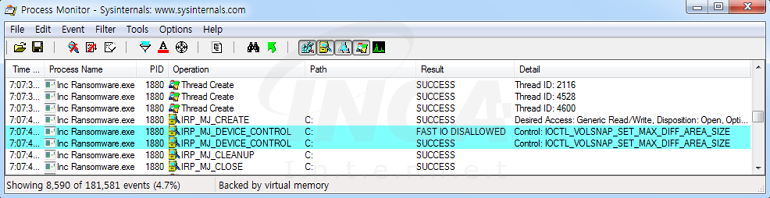 이를 위해 “volsnap.sys” 드라이버에 IRP_MJ_DEVICE_CONTROL 요청과 함께 제어 코드를 전달해 저장 공간 크기를 변경하며, [그림 10]은 드라이버에 요청된 작업을 프로세스 모니터로 확인한 결과이다.