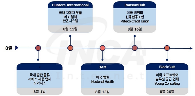 2024년 8월(8월 1일 ~ 8월 31일) 한 달간 랜섬웨어 동향을 조사한 결과, 미국의 비영리 신용협동조합 Patelco Credit Union에서 "RansomHub" 랜섬웨어의 공격으로 데이터가 유출된 정황이 발견됐다. 또한, 미국의 병원 Kootenai Health와 미국의 소프트웨어 솔루션 공급 업체 Young Consulting에서 각각 "3AM"과 "BlackSuit" 랜섬웨어 공격으로 운영이 중단된 정황이 알려졌다. 한편, 국내의 출판 물류 솔루션 공급 업체 모아시스에서 랜섬웨어 공격을 받았다고 전했으며, "Hunters International" 랜섬웨어가 국내의 자동차 부품 제조 업체 한온시스템을 공격했다고 주장한 정황이 전해졌다.