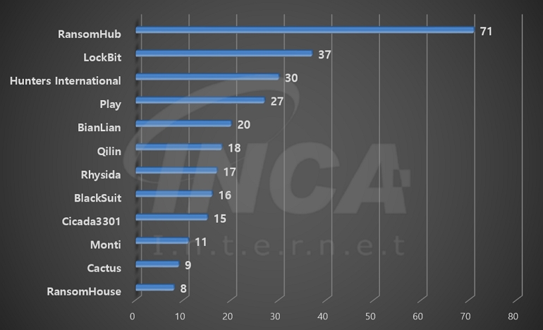 2024년 8월(8월 1일 ~ 8월 31일)에 발생한 데이터 유출 현황을 랜섬웨어 진단명 별로 비교하였을 때 “RansomHub” 랜섬웨어가 71건으로 가장 많은 데이터 유출이 있었고, “LockBit” 랜섬웨어와 “Hunters International” 랜섬웨어가 각각 37건과 30건의 유출 사례를 기록했다.