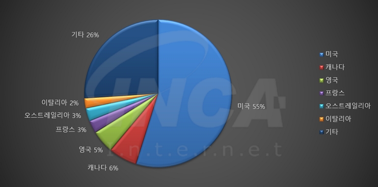 2024년 8월(8월 1일 ~ 8월 31일)에 발생한 데이터 유출 건을 국가별로 비교하였을 때 미국이 55%로 가장 높은 비중을 차지했고, 캐나다와 영국이 각각 6%와 5%로 그 뒤를 따랐다.
