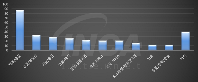 2024년 8월(8월 1일 ~ 8월 31일)에 발생한 데이터 유출 건을 산업별로 비교하였을 때 제조/공급 분야가 가장 많은 공격을 받았고, 건설/부동산 분야와 기술/통신 분야가 그 뒤를 따랐다.