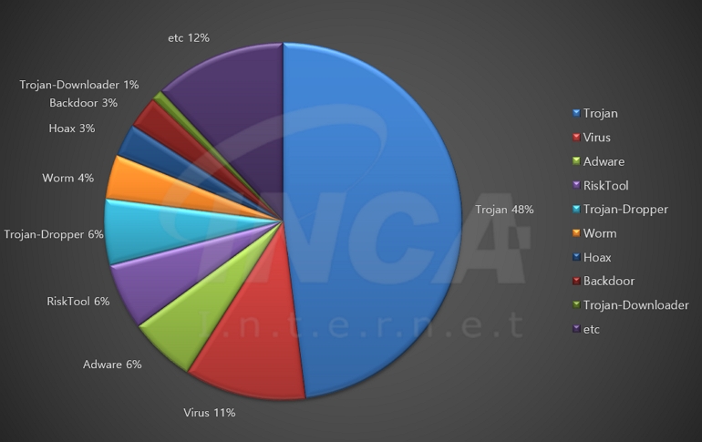 2024년 8월(8월 1일 ~ 8월 31일) 한 달간 잉카인터넷 대응팀은 국내외에서 수집된 악성코드 현황을 조사하였으며, 유형별로 비교하였을 때 “Trojan”이 48%로 가장 높은 비중을 차지했고, “Virus”가 11%로 그 뒤를 따랐다.