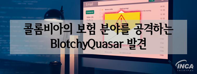 보안 업체 Zscaler ThreatLabz의 연구에 따르면 콜롬비아 세무 당국을 사칭한 피싱 이메일로부터 공격이 시작된다고 밝혔다. 공격자는 해당 이메일에 첨부된 PDF 첨부 파일 혹은 이메일 본문에 포함된 링크를 클릭하도록 유도한다. 사용자가 파일과 링크를 클릭하면 Google Drive 폴더의 ZIP 보관 파일로 연결되어, 최종 페이로드인 BlotchyQuasar라는 Quasar RAT의 변형 악성코드가 다운로드된다. 이후, BlotchyQuasar는 키 입력 기록, 셸 명령 실행 및 웹 브라우저와 FTP 클라이언트에서 데이터를 탈취한다. 또한, 콜롬비아와 에콰도르에 있는 특정 은행 및 지불 서비스와 사용자의 상호 작용을 모니터링하는 기능도 포함되어있다고 덧붙였다.