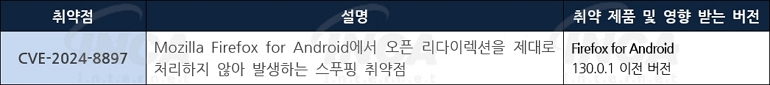 Mozilla 사는 제품에서 발생하는 취약점에 대한 보안 업데이트를 발표하고, 관련 취약점을 해결하기 위해 최신 버전으로 업데이트할 것을 권고하였다.
