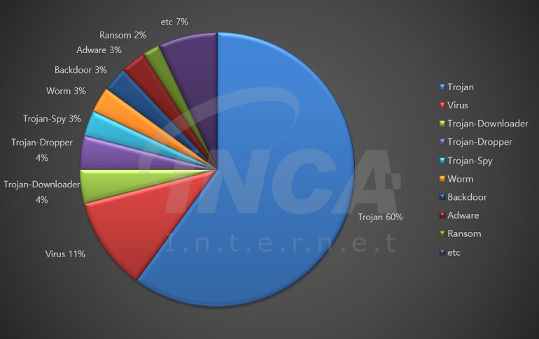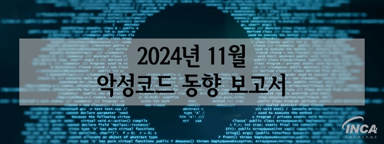 2024년 11월(11월 1일 ~ 11월 30일) 한 달간 잉카인터넷 대응팀은 국내외에서 수집된 악성코드 현황을 조사하였으며, 유형별로 비교하였을 때 “Trojan”이 60%로 가장 높은 비중을 차지했고, “Virus”가 11%로 그 뒤를 따랐다.