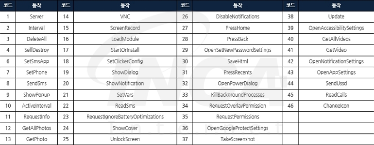 “TrickMo” 앱이 실행되면 먼저 공격자가 운영하는 C&C 서버와 통신해 모델 정보, 빌드 버전 및 설정 정보 등의 기본 정보를 전송한다. 이후 화면 녹화, SMS 데이터 및 통화 기록 등의 민감한 데이터를 수집하고 [표 1]의 목록을 포함한 45개의 명령어를 서버로부터 수신해 추가 동작을 수행한다. 단, 분석 시점에서 서버가 응답하지 않아 추가 데이터 교환은 발생하지 않았다.