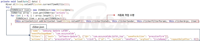 또한, 접근성 서비스를 악용해 앱의 리소스 중 “clicker.json” 파일에 미리 정의된 자동화 작업을 수행한다. 해당 파일에는 알람, 업데이트 및 앱 설치/삭제 등의 이벤트가 발생했을 때의 주체가 되는 패키지 이름과 수행할 작업이 명시돼 있다. [그림 7]은 삼성 업데이트를 차단하는 작업의 예시로 “Samsung Update LATER” 이벤트에 대해서 자동으로 “pressConfirm”을 클릭한다.