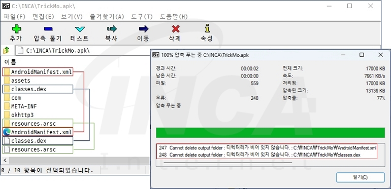 “TrickMo” 악성 앱은 의도적으로 APK 파일의 구성을 변형시켜 압축 해제 및 정적 분석 툴이 정상적으로 기능할 수 없도록 해 분석을 방해한다. [그림 1]에서 APK 파일의 구성 요소인 “AndroidManifest.xml”, “classes.dex” 및 “resources.arsc” 파일과 동일한 이름의 폴더가 존재하는 것을 확인할 수 있으며 압축 해제 시 폴더가 먼저 추출되고 동일한 이름의 파일이 추출될 때 폴더를 덮어쓸 수 없어 오류가 발생한다. 따라서, 오류가 발생하는 폴더를 제거한 후 APK 파일을 리패키징해 분석을 진행했다.