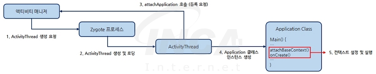 재정의된 Application 클래스의 메서드는 안드로이드 OS에서 앱 실행 시 앱의 전역 상태를 초기화할 때 호출되며 [그림 4]의 애플리케이션 구동 순서에서 확인할 수 있다. 안드로이드 OS에서 앱을 실행하면 먼저 액티비티 매니저는 Zygote 프로세스에 앱을 실행시킬 ActivityThread의 생성을 요청한다. Zygote 프로세스가 ActivityThread를 생성하고 로드하면 해당 스레드는 “attachApplciation()” 메서드를 호출해 액티비티 매니저에 자기 자신의 등록을 요청하고 등록 과정에서 앱의 Application 클래스의 인스턴스를 생성한다. 이후, Application 클래스는 “attachBaseContext()”로 실행 컨텍스트를 설정하고 “onCreate()”로 앱을 시작한다.