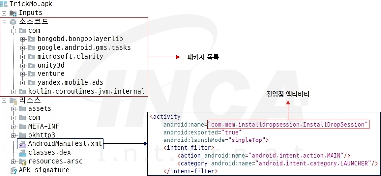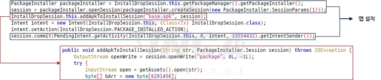 동적으로 로드된 진입점 액티비티는 “getAssets()” 메서드를 이용해 리소스에 저장된 “TrickMo”의 APK 데이터를 읽어온 후 “PackageInstaller”로 앱을 설치한다.
