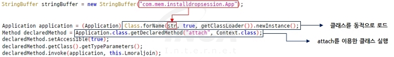 [그림 3]에서 재정의된 메서드는 Assets에 저장된 Dex 파일을 복호화하고 진입점 액티비티인 “InstallDropSession” 클래스를 동적으로 로드한다, 이후, Application 클래스의 “attach()” 메서드를 이용해 로드된 클래스를 실행한다.